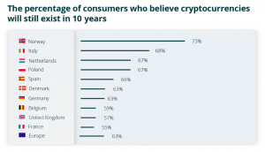 Interestingly, Norwegian people are the most optimistic towards cryptocurrency, 73% of people surveyed think that crypto will exist. While the Frech turned out to be pessimistic about crypto’s future, only 55% believe in crypto.